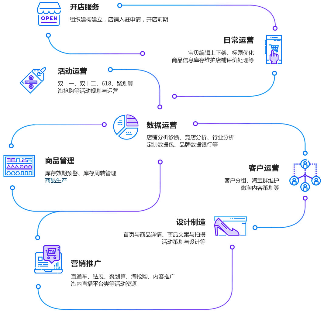 我們?yōu)槠髽I(yè)提供全電商平臺的一站式代運營方案,深入企業(yè)開展電商的每一個環(huán)節(jié)